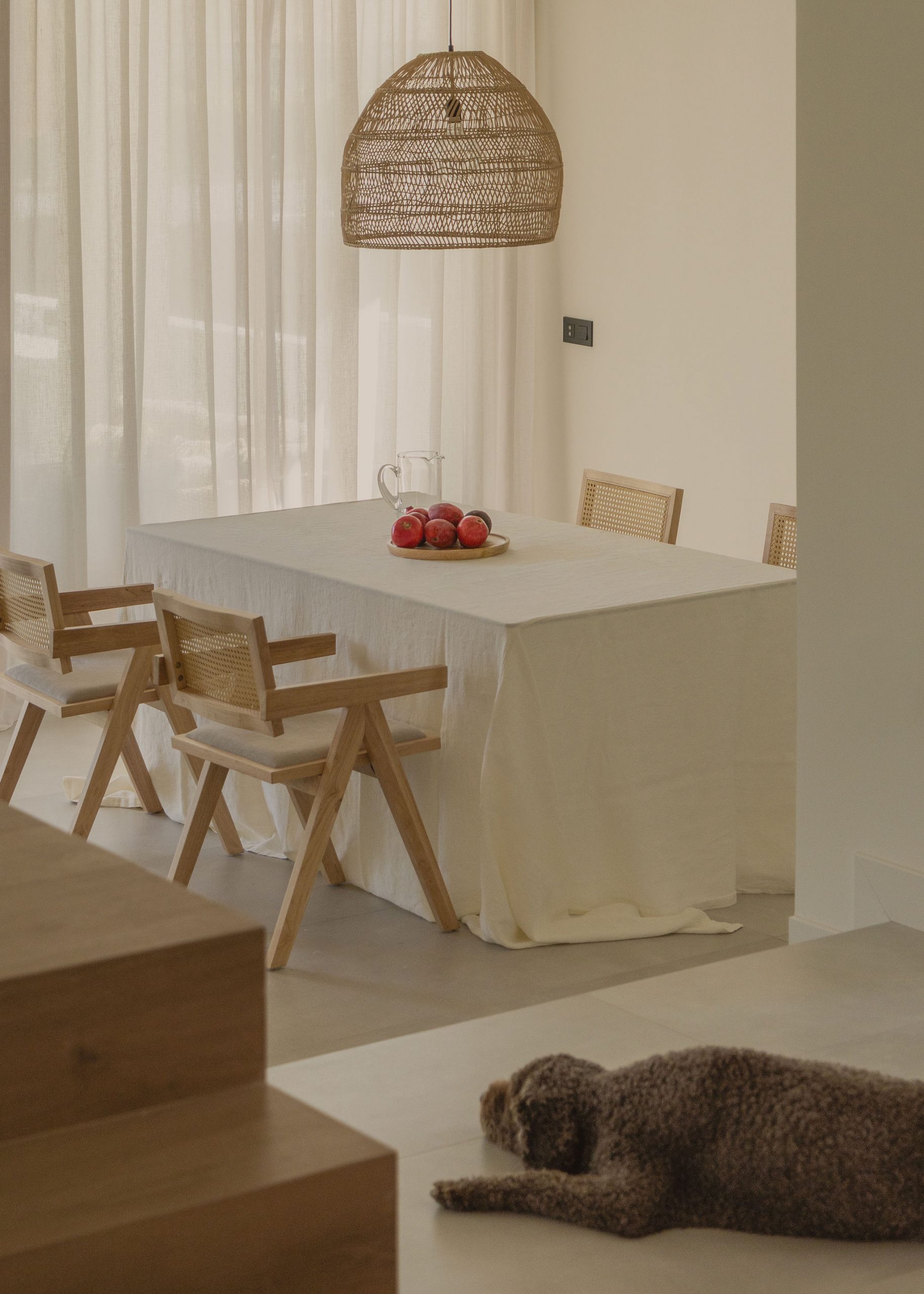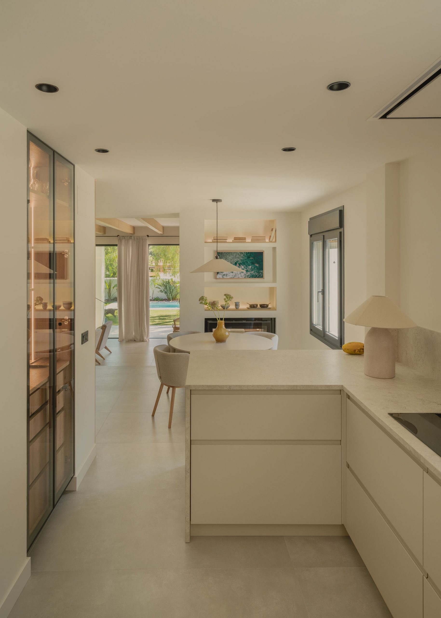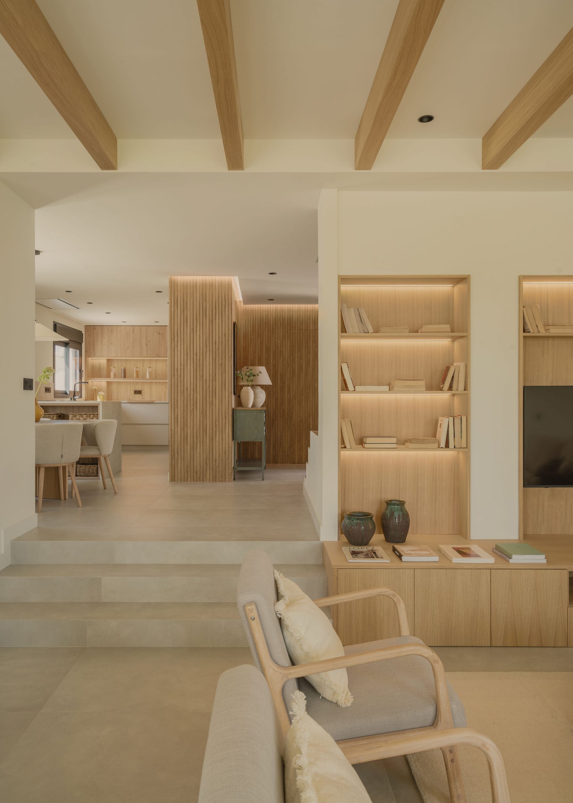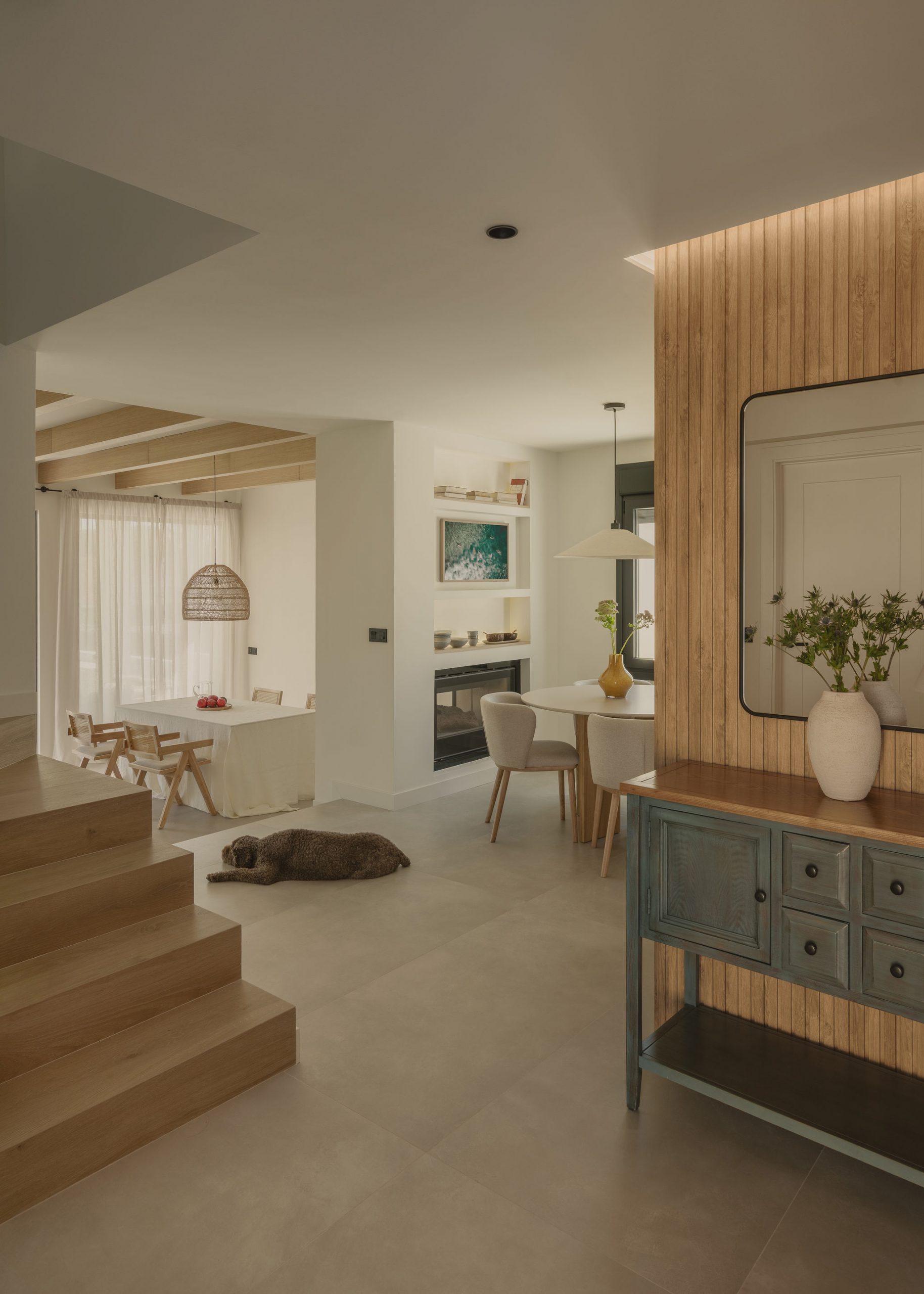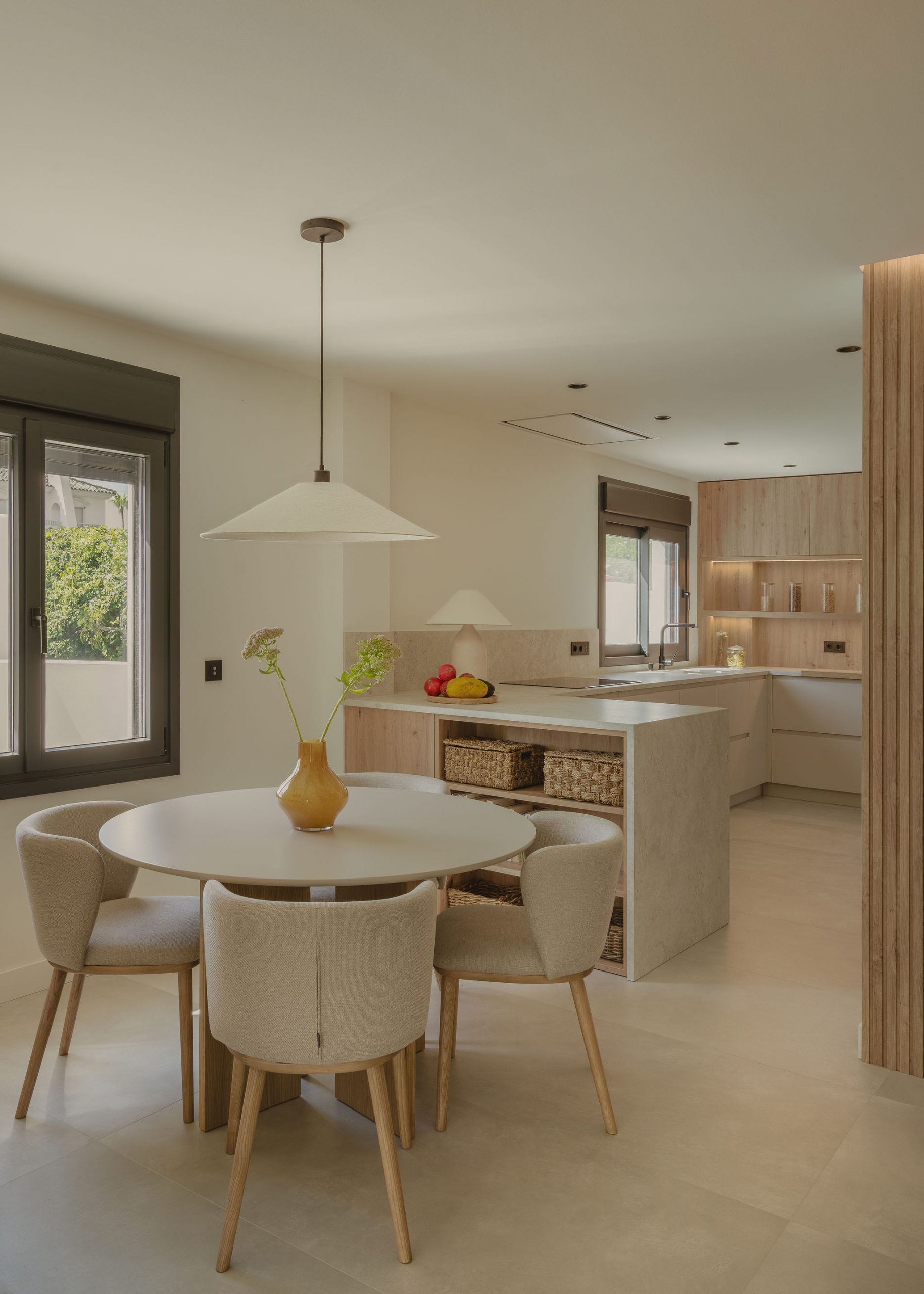Reforma integral de vivienda unifamiliar aislada. Con un marcado estilo mediterráneo y tintes tropicales, la intervención busca potenciar la relación entre la arquitectura y su entorno natural. La conexión con el mar y el concepto de “slow life” fueron el punto de partida del diseño: los reflejos del agua y los tonos verdes del jardín se integran en el interior a través de una paleta cromática suave y materiales naturales que refuerzan la sensación de calma y frescura. La intención principal fue abrir los espacios para conectar el interior con el exterior, favoreciendo la entrada de luz natural en todas las estancias y generando una continuidad visual entre las zonas de día, el porche y el jardín. El resultado es una vivienda luminosa, relajada y en sintonía con su entorno costero —un refugio contemporáneo donde la luz, el mar y la vegetación se convierten en protagonistas.